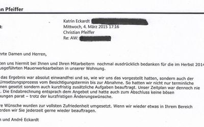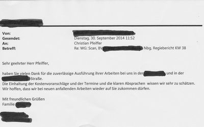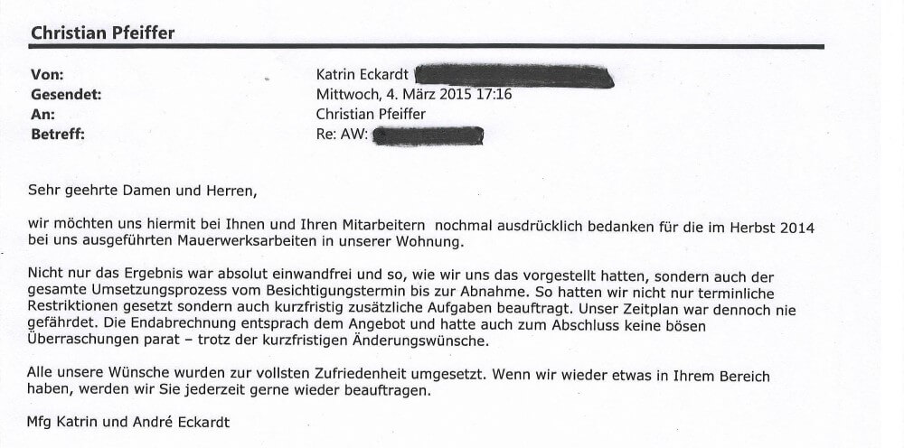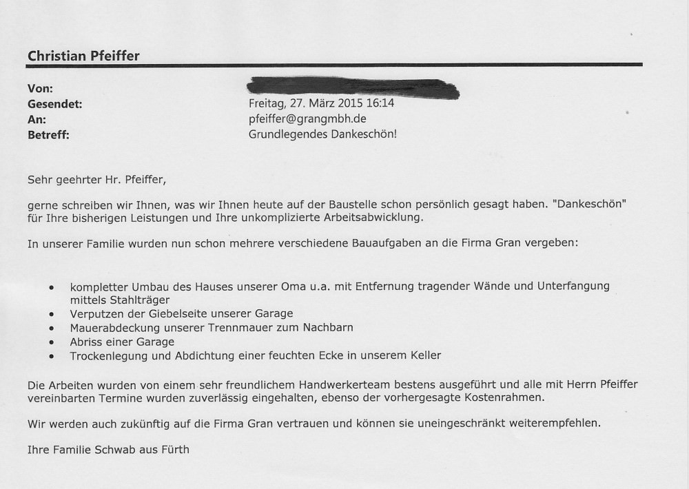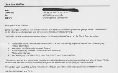 Wir freuen uns besonders wenn uns auch unsere privaten Bauherren ein positives Feedback geben. Unser Ziel ist es, dass unsere Kunden zufrieden sind. Durch unsere Stärken sind wir auch für Sie ein zuverlässiger und kompetenter Partner!