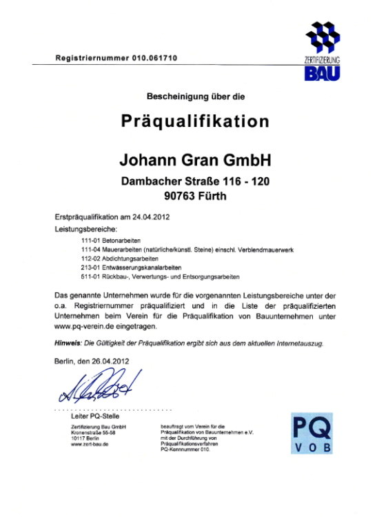 Die Präqualifizierung bescheinigt uns die ordnungsgemäße Einhaltung des Mindestlohns, fristgerechte Zahlung aller sozialrechtlichen Abgaben und Erfüllung der steuerlichen Pflichten.