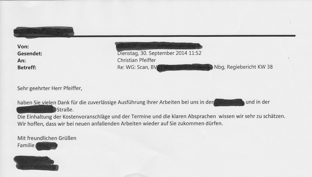 Wir freuen uns besonders wenn uns auch unsere privaten Bauherren ein positives Feedback geben. Unser Ziel ist es, dass unsere Kunden zufrieden sind. Durch unsere Stärken sind wir auch für Sie ein zuverlässiger und kompetenter Partner!
